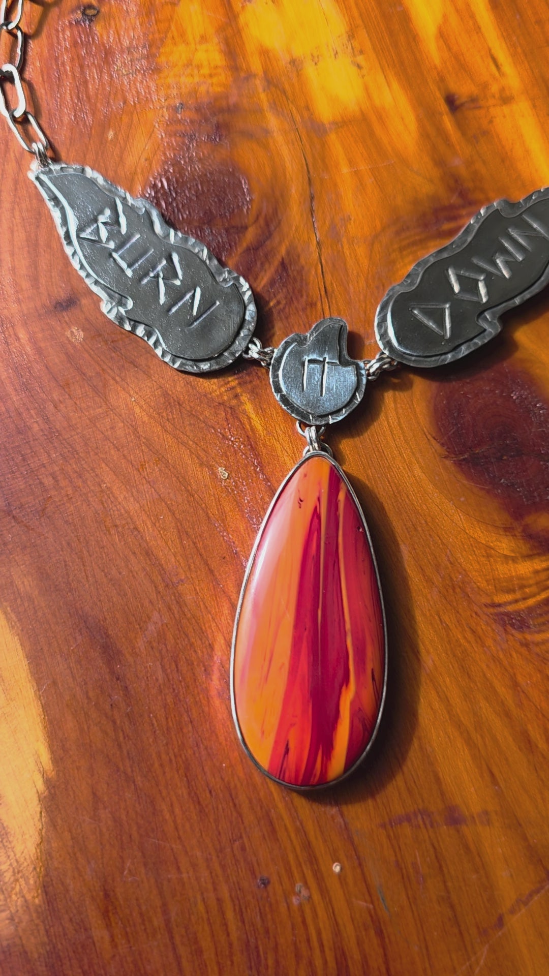 BURN IT DOWN. This one-of-kind necklace is both a statement and a protest. It features a long, smooth drop shaped Rosarita cabochon with gorgeous flame-like patterning and color. It was cut and cabbed here in-house by my partner and Lapidarist, Max Avila. It's set in smooth sterling silver and hangs below the words, BURN IT DOWN hand stamped with a liner stamp on layered and textured sterling silver flame shapes.