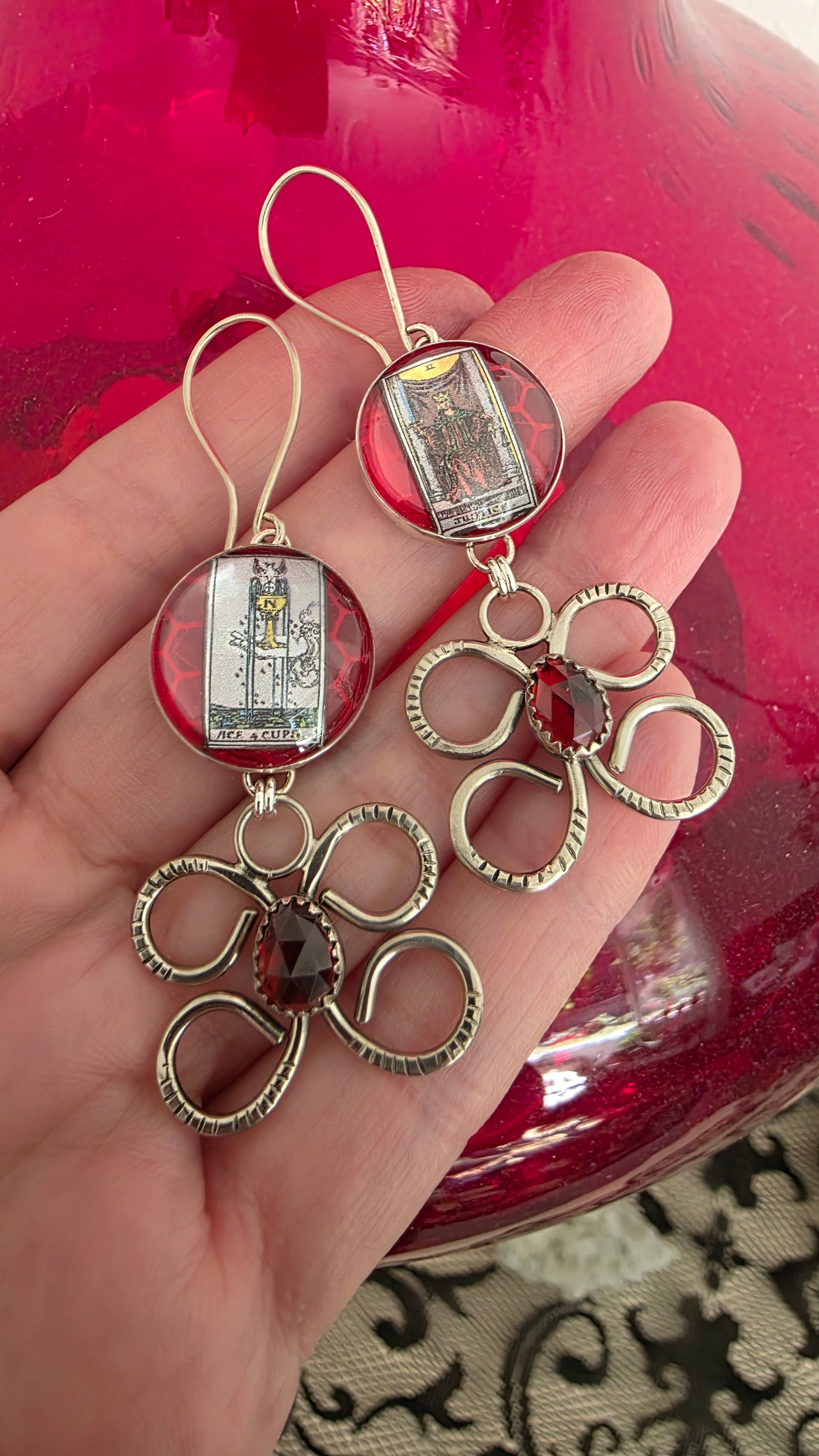 These one-of-a-kind Tarot earrings feature mini cards: Ace of Cups and Justice encapsulated behind glass and set in sterling silver.