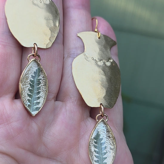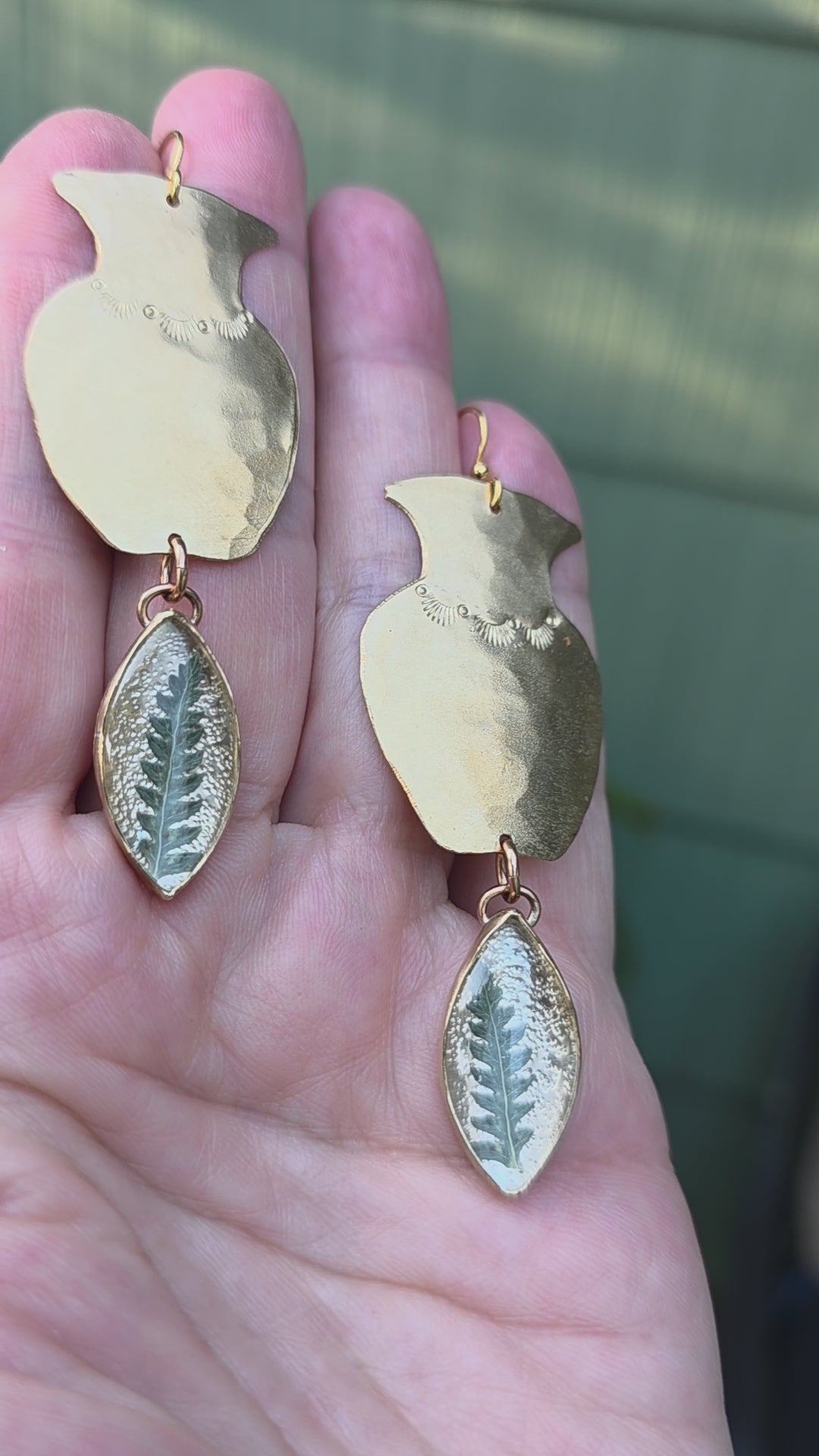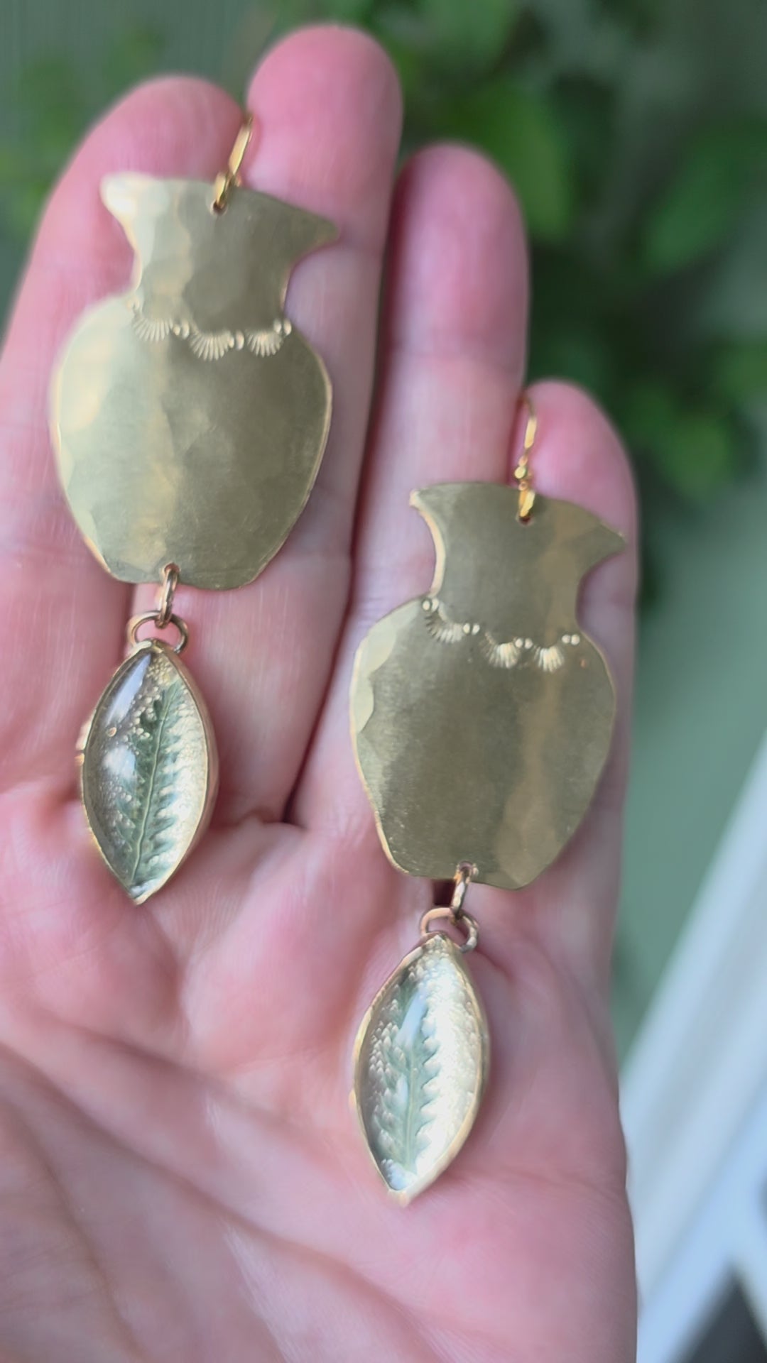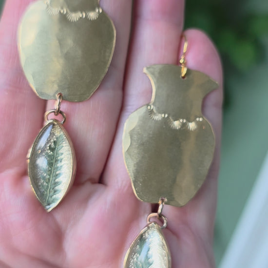 These one-of-a-kind earrings feature hammered Amphora shapes with encapsulated real fern tips behind solid glass marquise cabochons set in smooth, golden yellow jeweler's brass, the closest and most accessible metal in color to 14K gold, which is why I love it so much. The wearer can choose to let it oxidize and patina over time OR use a silver polishing cloth like a Sunshine cloth, just as you would on sterling silver, to keep the bright golden shine alive. All handfabricated from jeweler's brass sheet, then cut, shaped, soldered, sanded, polished into form.