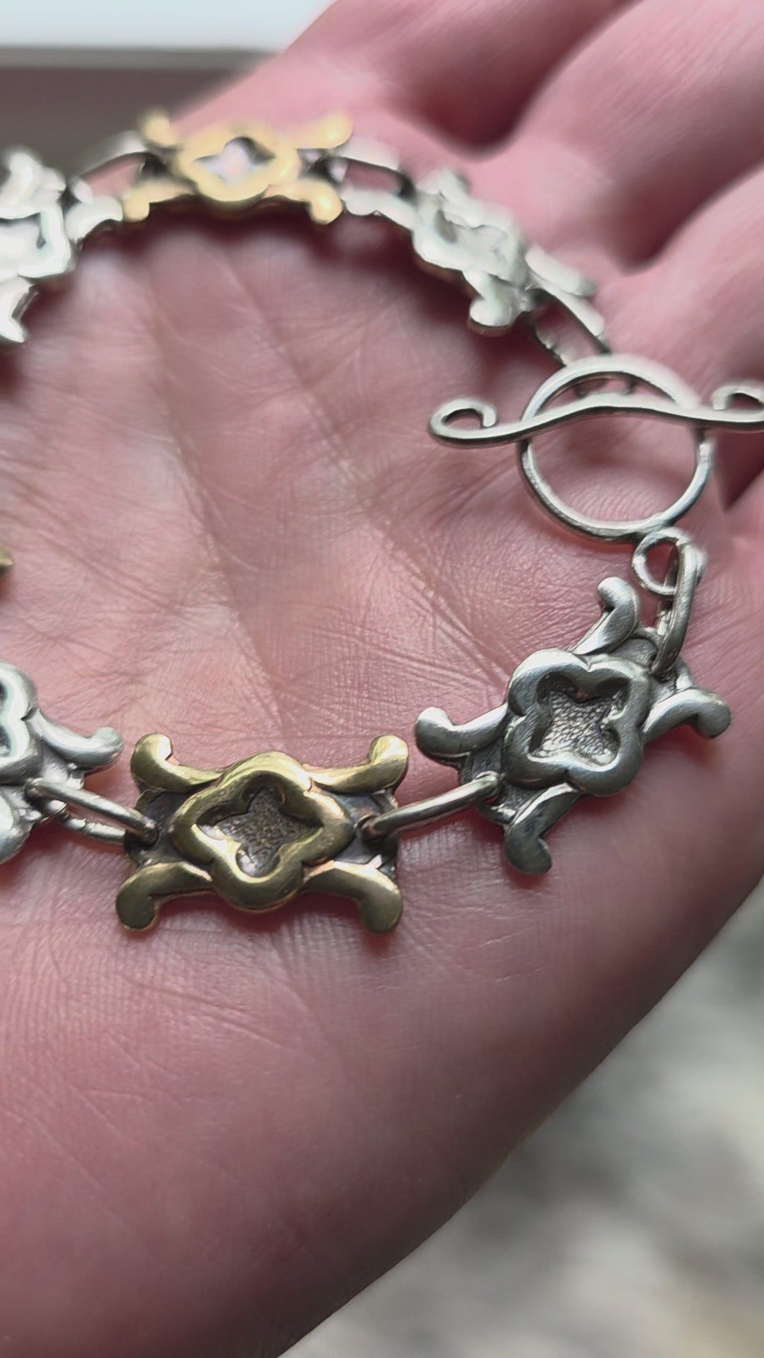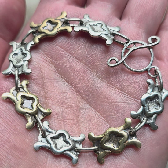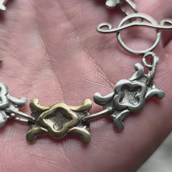 Link by link, breath by breath, moment to moment. I feel it's so important to stay as present as possible these days. Creating this bracelet was a practice in presence. This one-of-a-kind beauty features antiquity-inspired links, 4 in sterling silver and 3 in jeweler's brass. They were created from 18 gauge sheet, then linked with sterling silver wire and one of my curvy hand-fabricated toggle clasps. All links are soldered closed to make sure they endure the test of time and that this bracelet becomes an heirloom.