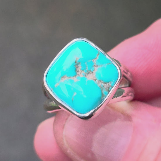 This ring features gorgeous, nugget cut Turquoise Mountain, cut and cabbed here in-house by my partner and Laipdarist, Max Avila. I absolutely love his nugget style cabs, as they carry a bit of their natural texture into jewelry, and this one is a beauty. He even polished the back side.