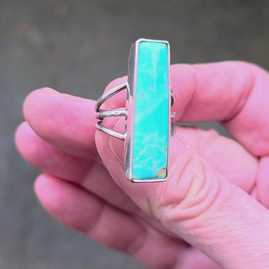 This ring features gorgeous, long bar cut Tyrone Turquoise! Cut and cabbed here in-house by my partner and Laipdarist, Max Avila. I love working with bar shapes so much. It's set in smooth sterling silver to showcase this turquoise.