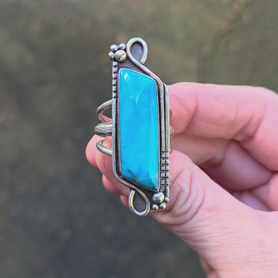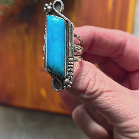 This ring features a gorgeous, deep bright blue, higher profile, glossy Ithaca Peak Turquoise. It's quite the chunky and so blue! Cut and cabbed here in-house by my partner and Laipdarist, Max Avila.