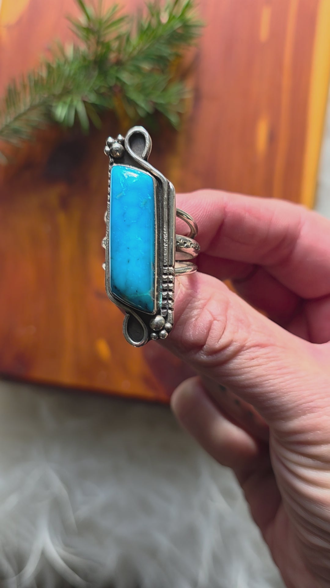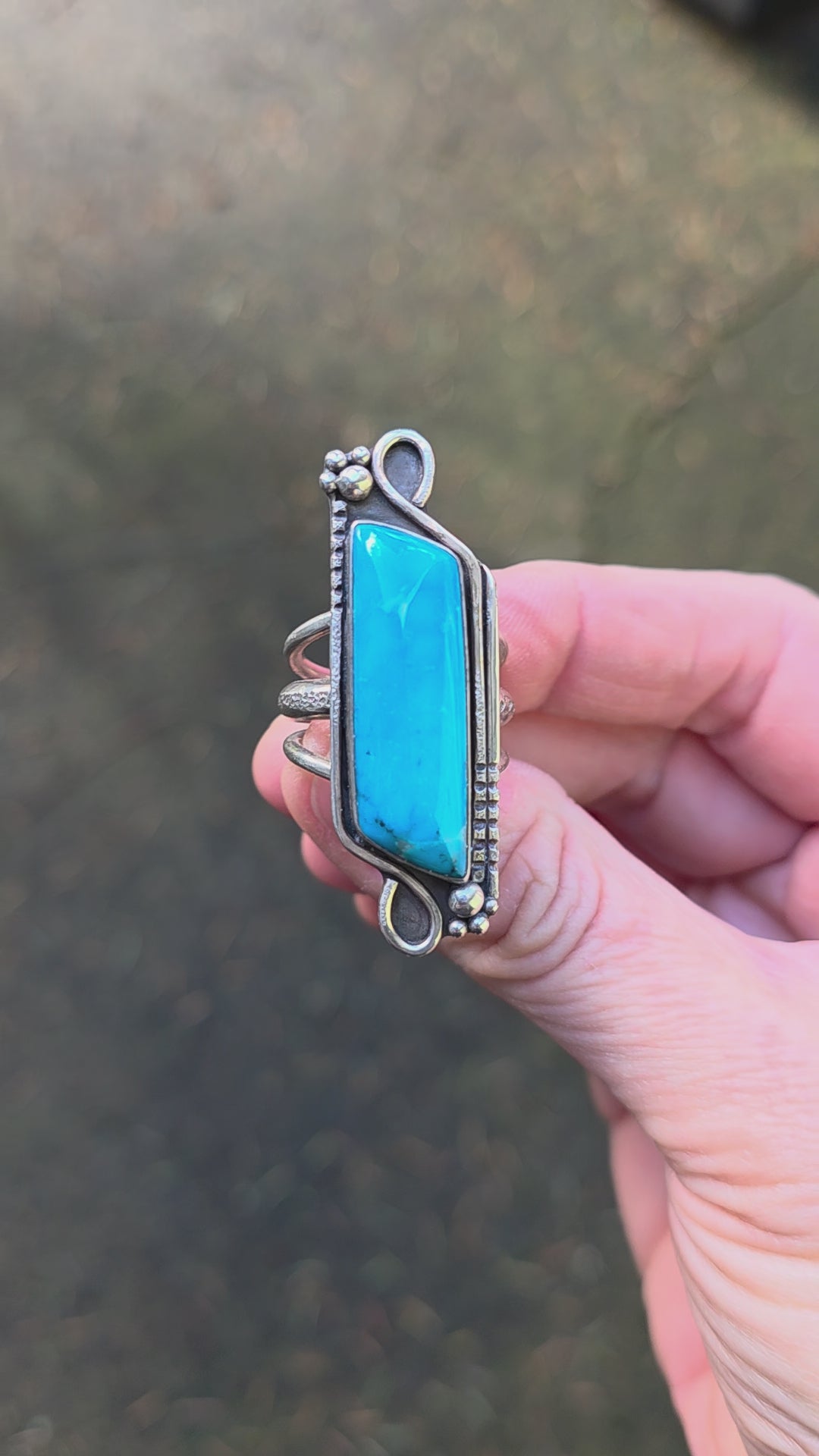 I set out to give a vintage look and feel with some abstract, asymmetrical silver work, and did my best not to distract from the beauty of the turquoise.