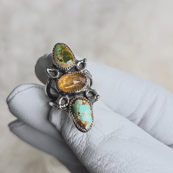 This triple stone beauty features two natural, polychrome Stone Mountain turquoise, acquired directly from the mine in Nevada. My favorite turquoise for so many reasons. In the center is sparkling, rose cut oval Imperial Topaz that picks up the golden color in the turquoise matrix. All set in serrated sterling bezels with abstract, petal-like silver details.