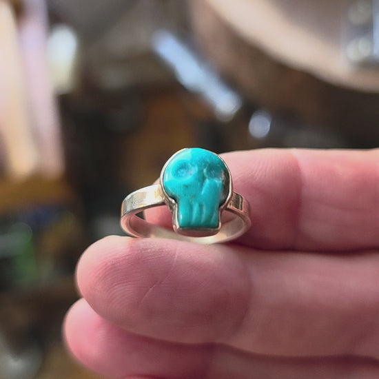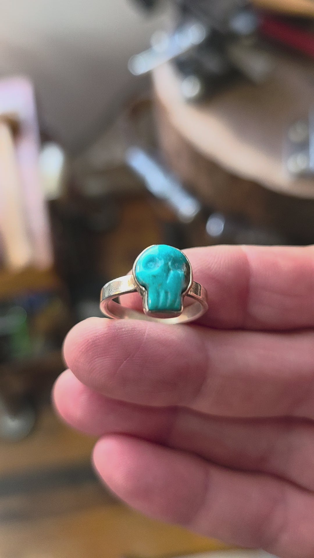This ring features a hand carved Kingman Turquoise skull. Cut and cabbed here in-house by my partner and Laipdarist, Max Avila. Then, I carved the face of the skull into the turquoise, and set it into smooth silver.