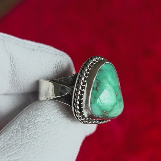 This men's style ring features Nevada Variscite set in smooth sterling silver and surrounded by a twist border. All sterling silver.
